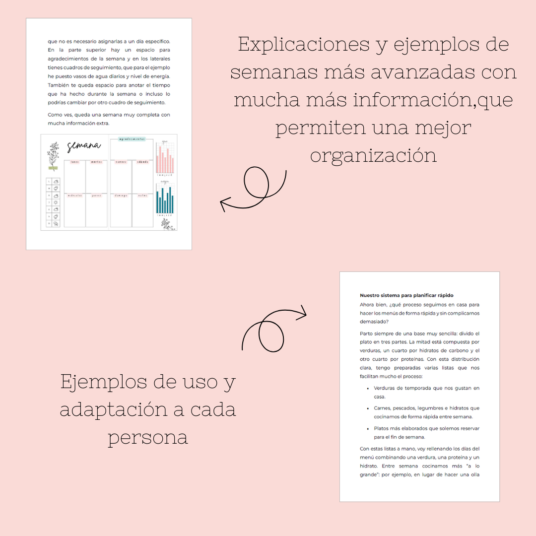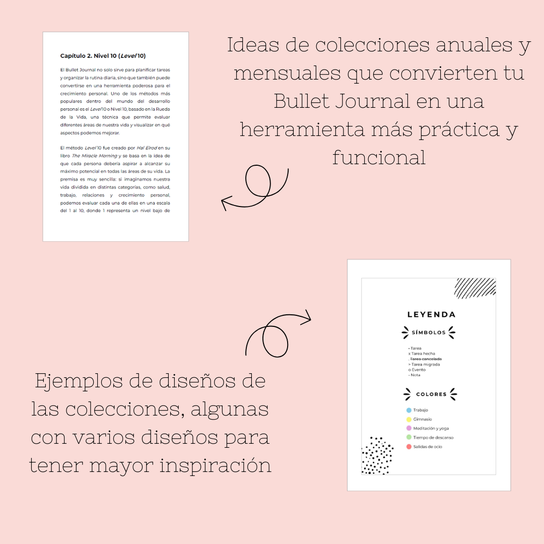 • Explicación detallada de colecciones mensuales como: menú semanal y mensual, objetivos mensuales, horario de tareas, brain dump, gastos mensuales, etc.