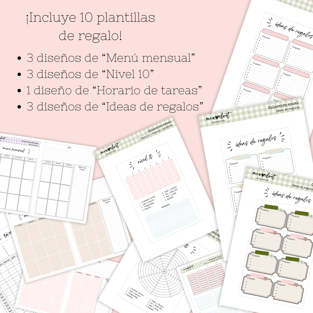 • Regalo de 10 plantillas descargables e imprimibles de colecciones listas para usar: tres diseños de ideas de regalos, 3 diseños de menú mensual, 3 diseños de nivel 10, y horario de tareas