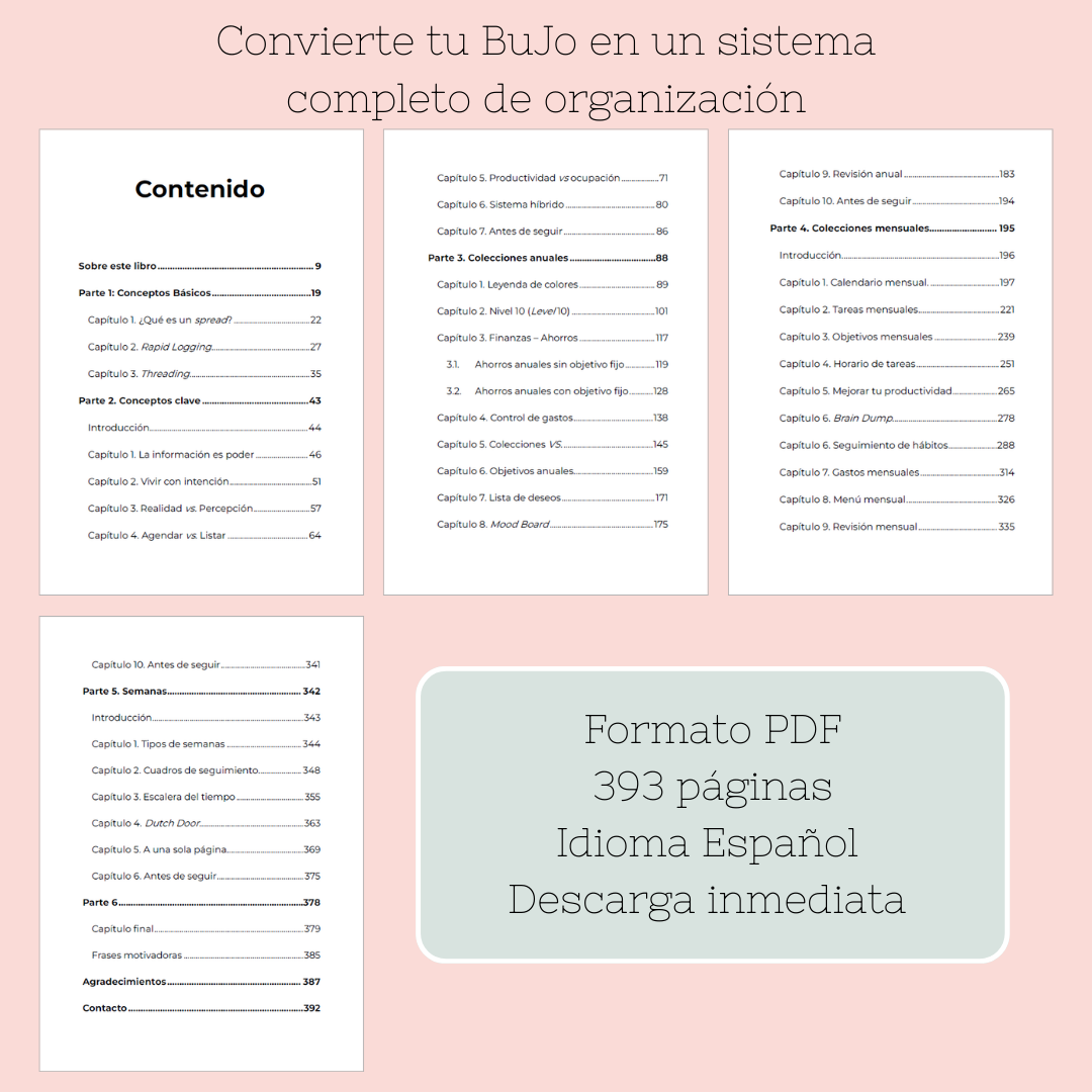 Es un libro digital en formato PDF de 393 páginas que amplía y profundiza en el método Bullet Journal. Mientras que el primer volumen se centra en los fundamentos, este segundo libro te acompaña a explorar técnicas avanzadas, nuevas estructuras y colecciones más ricas para convertir tu Bullet Journal en un sistema de organización completo. Incluye explicaciones claras, ejemplos prácticos y apartados para reflexionar y trabajar en tu libreta a medida que avances en la lectura.