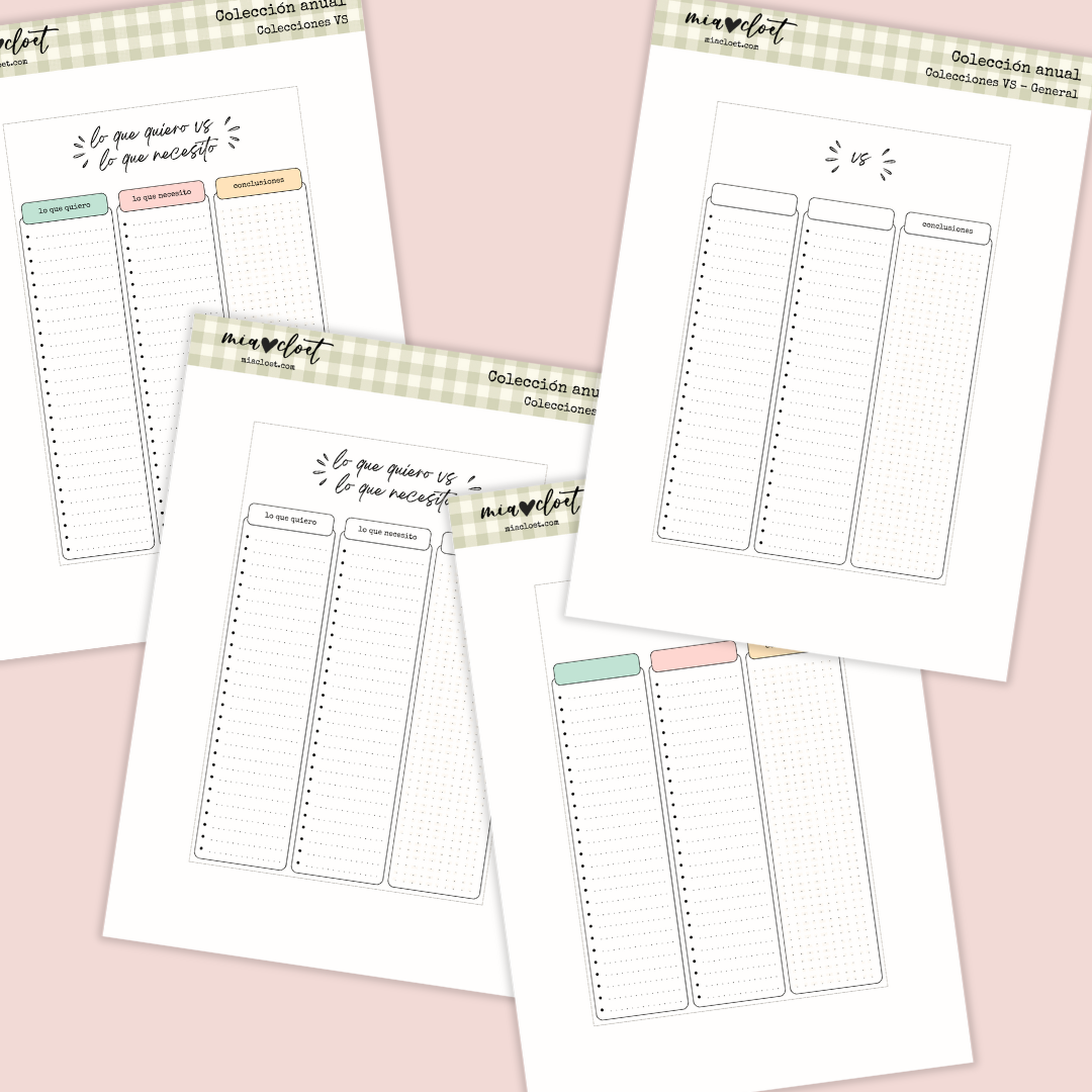 Cuatro plantillas con diferentes diseños para hacer una comparativa entre dos aspectos de tu vida, por ejemplo: lo que quiero VS. lo que necesito, o lo que he hecho VS. lo que debería haber hecho, cualquier aspecto que quieras comparar para sacar conclusiones. Encontrarás dos diseños con las frases ya escritas, ya que la versión de lo que quiero VS. lo que necesito es la más habitual, y dos diseños con los espacios en blanco para que puedas hacer tus propias colecciones VS.