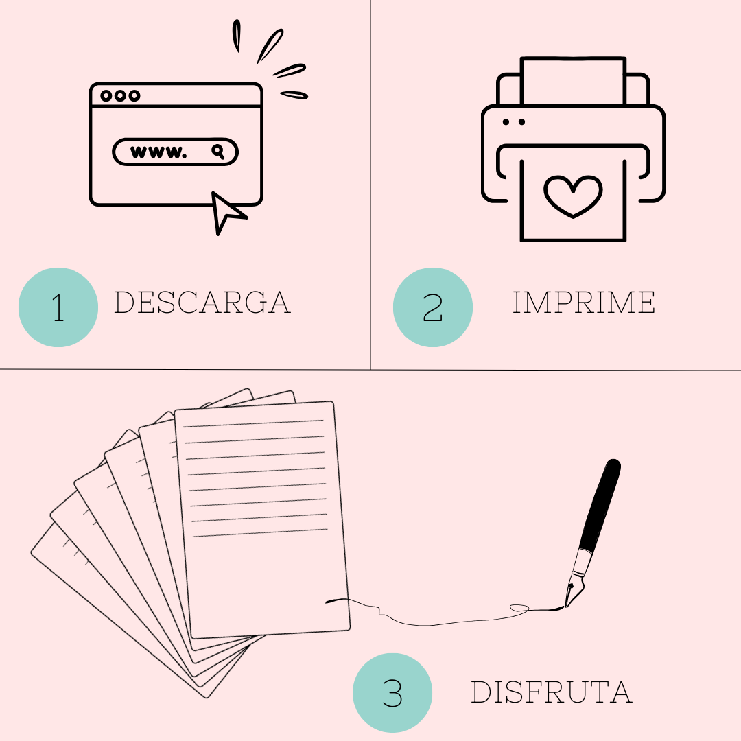 Puedes imprimir este dosier en hojas de impresión de 80 o 90 gramos. Te recomiendo utilizar papel blanco, para que el color del papel no altere los colores del propio diseño ni de los colores que utilices para marcar.