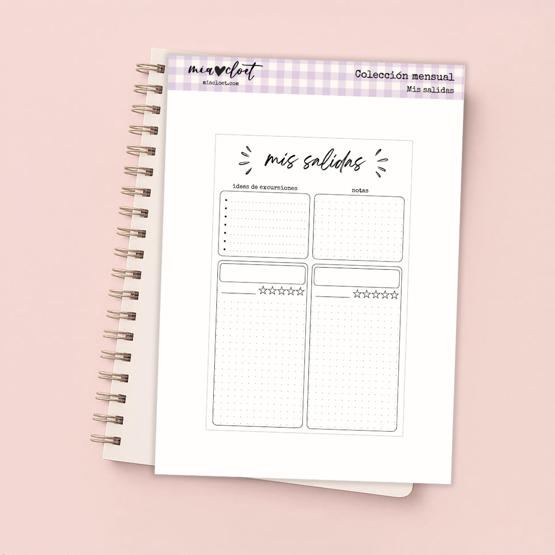 Una plantilla para anotar las salidas mensuales de ocio que hagamos en un mismo mes y tengamos un recuerdo bonito de esa excursión. Incluye un diseño de plantilla con espacio para dos salidas mensuales y para ideas. ¡No dejes de disfrutar tu tiempo de ocio al aire libre en tu Bullet Journal, planner o agenda con esta plantilla!
