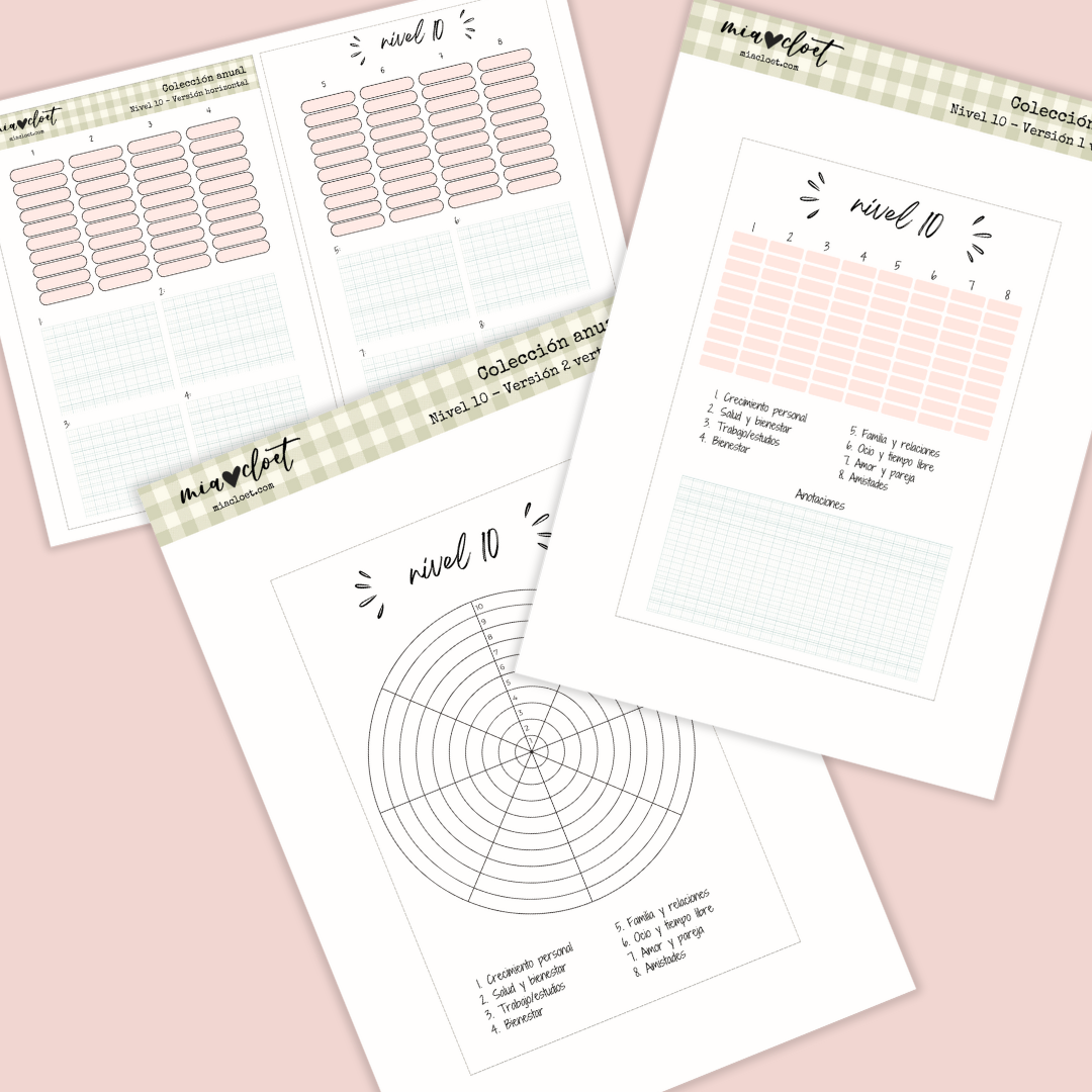 Tres plantillas tipo Nivel 10 (también conocida como Level 10 o rueda de la vida), pensadas para ayudarte a identificar en qué momento de tu vida te encuentras. Estas plantillas te permiten valorar diferentes áreas importantes, como familia, amistades, espiritualidad, economía, trabajo, bienestar, etc., y obtener una visión general de tu estado actual en una sola hoja.
