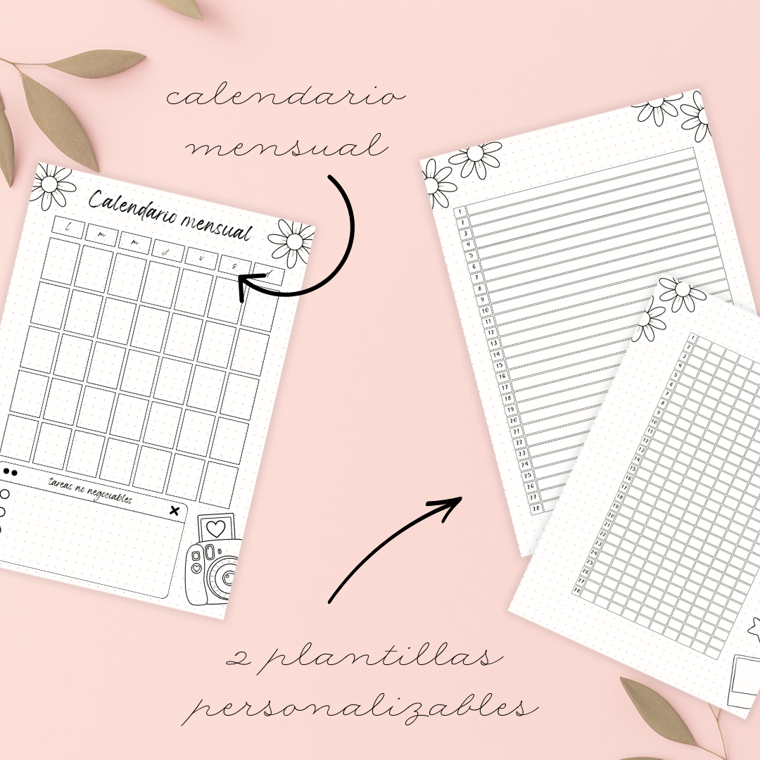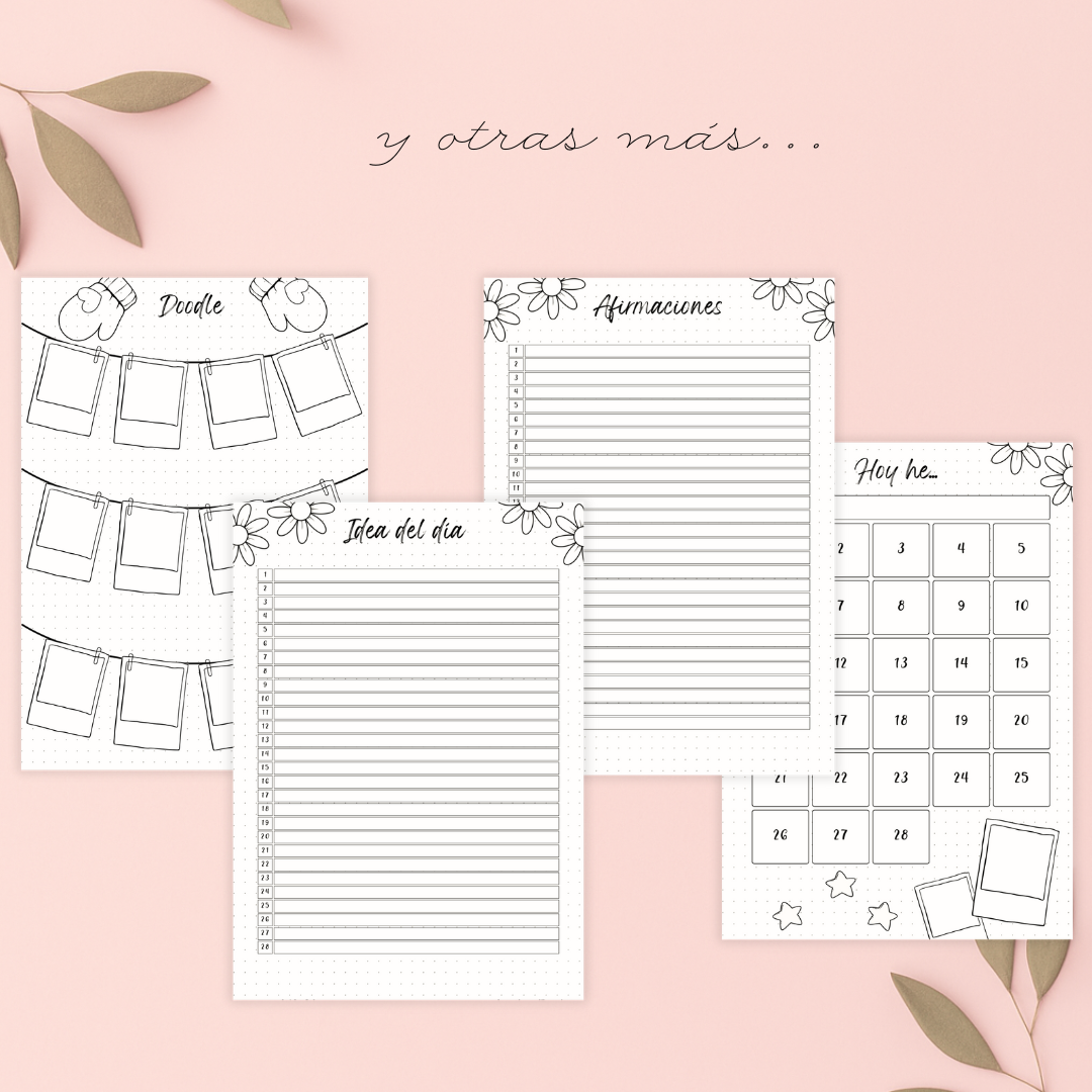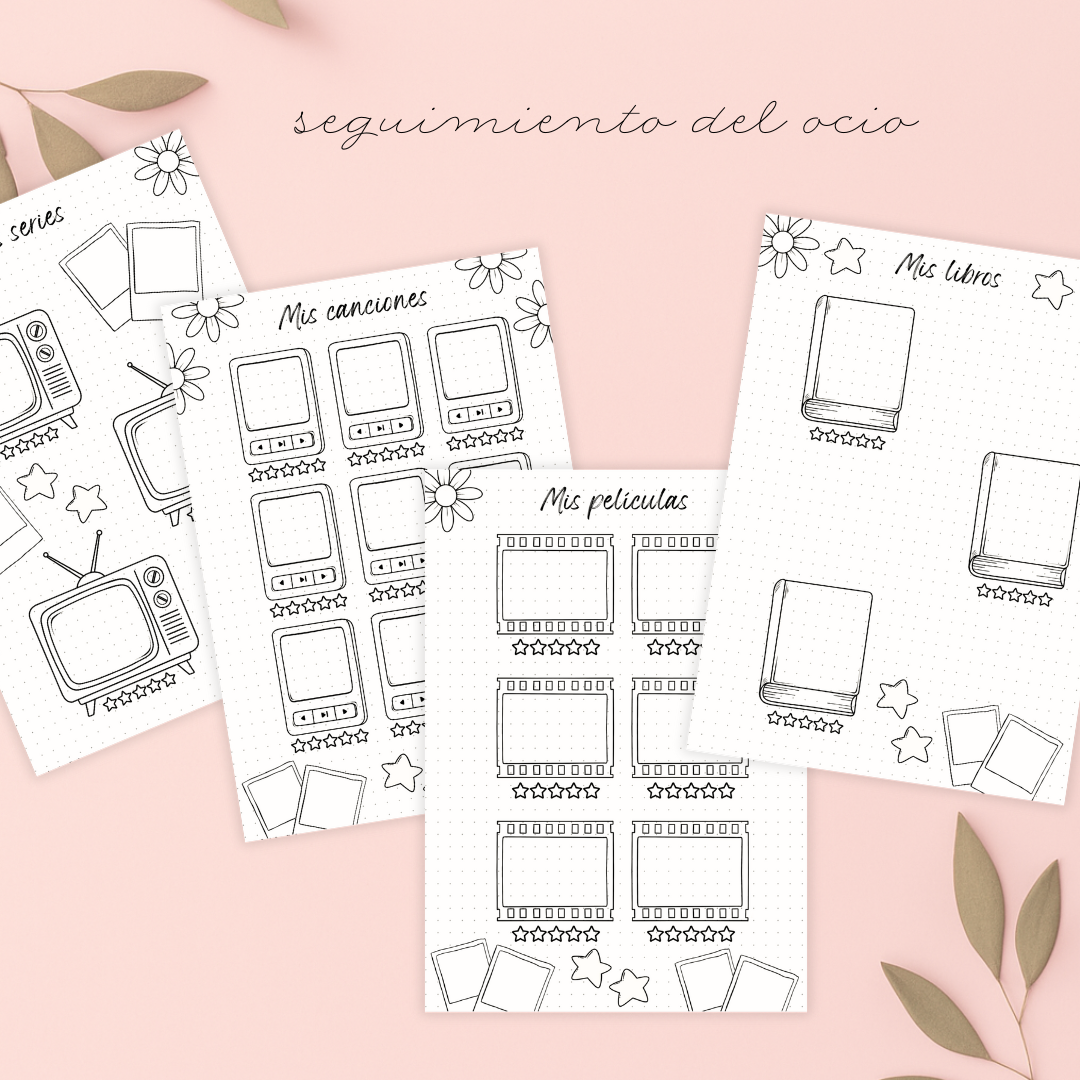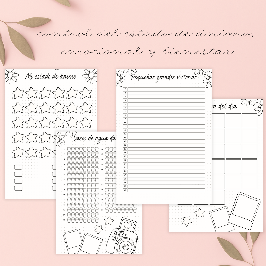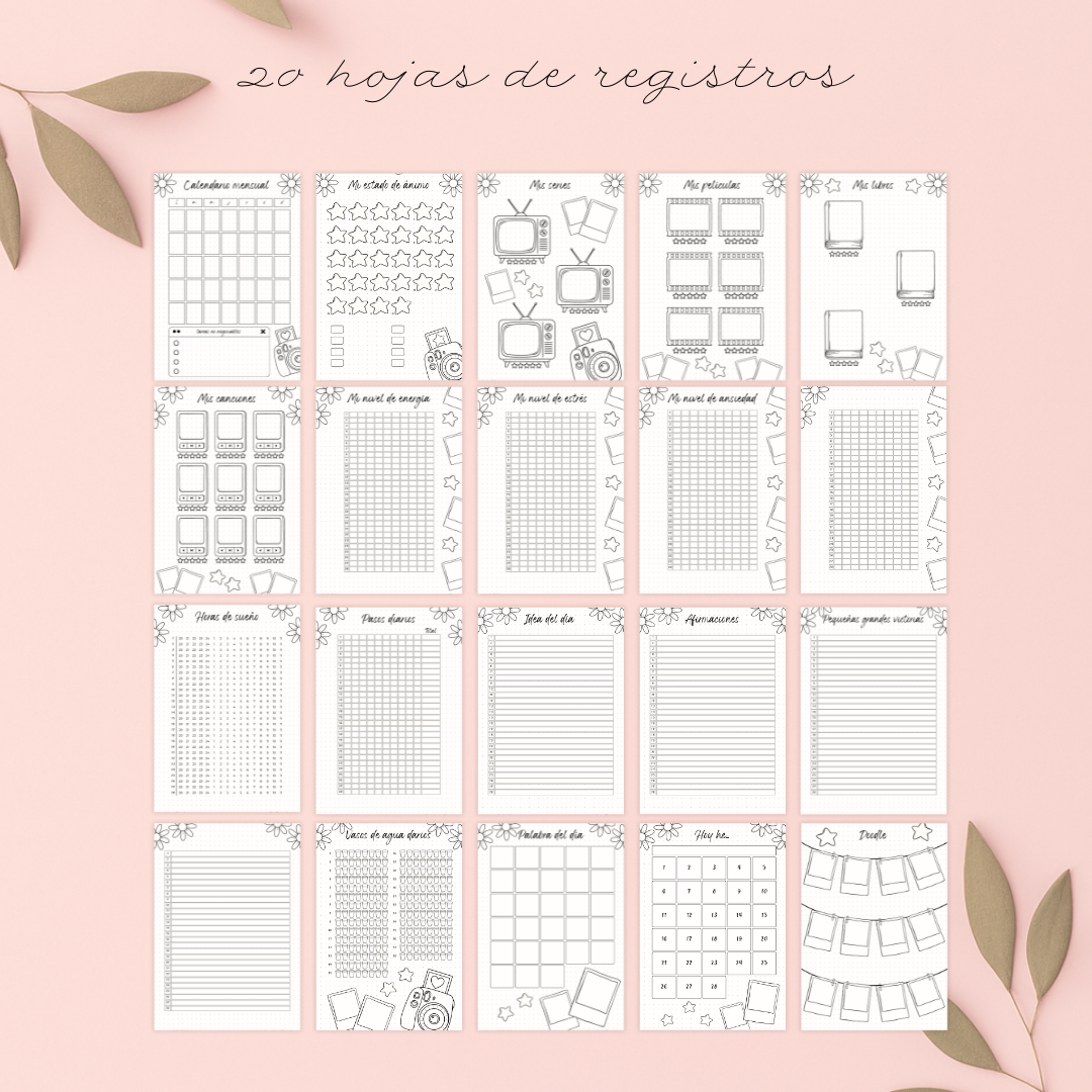Entre los registros encontrarás, entre otros: calendario mensual, estado de ánimo, series, películas, libros, música y podcasts, pasos diarios, ideas, afirmaciones, doodles y seguimiento de vasos de agua diarios. Además, incluye 2 plantillas sin título, pensadas para que puedas crear y personalizar tus propios registros según tus necesidades.