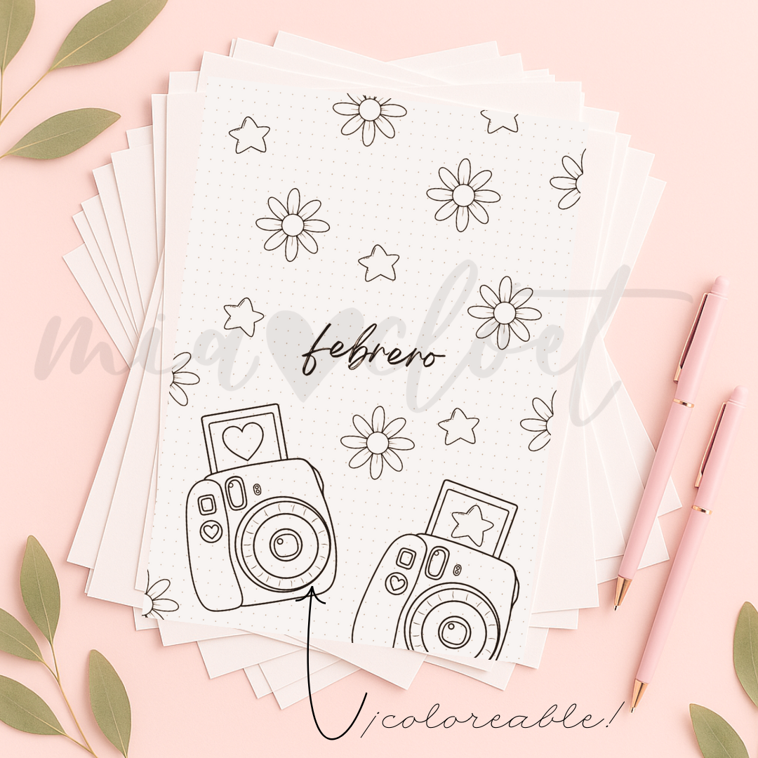 La temática de este mes de febrero está inspirada en fotos polaroid, estrellas y corazones, con ilustraciones en blanco y negro pensadas para que puedas colorear y personalizar el mes utilizando los colores que más te gustan.